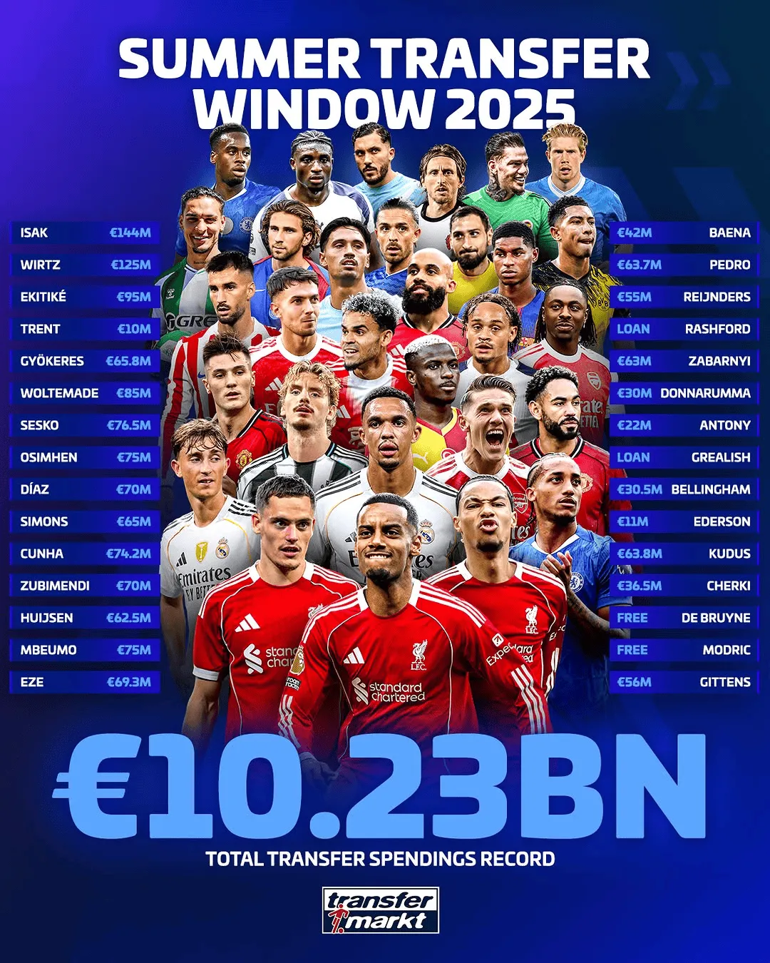 虎扑09月03日讯 随着2025年夏季转会窗的正式关闭,德转盘点了各大俱乐部总支出,这一数字高达102.3亿欧元,刷新了足球历史单一转会窗的纪录。