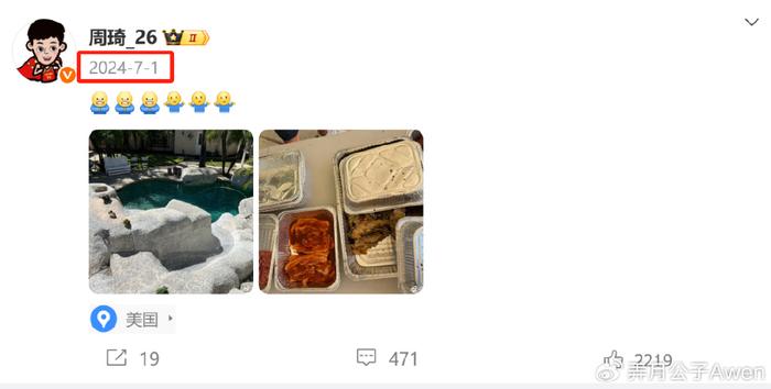 考虑到此前周琦在俱乐部就有过小伤大养的先例,如今在国家队又搞这一出,不少细心的球迷也翻出去年周琦也是在7月份的时候,晒出自己定位美国的美食和景色照,而当时周琦同样入选了国家集训队,但他并没有跟随中国男篮前往澳大利亚参加热身赛。